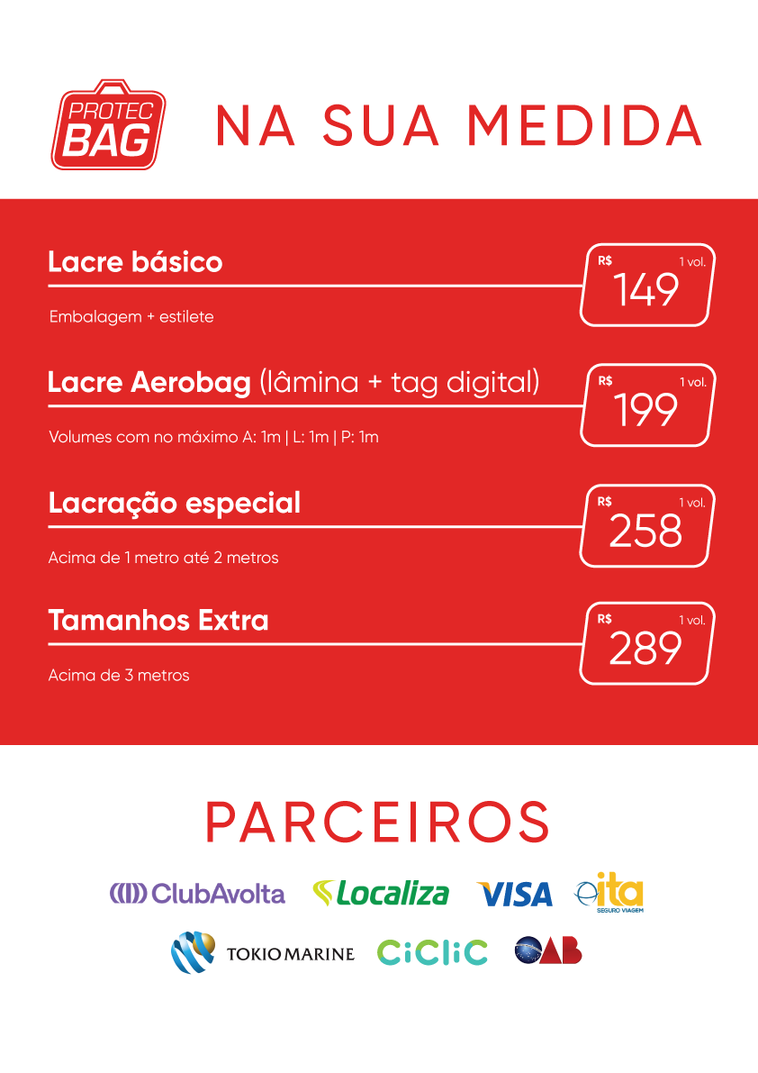 A Protect Bag ® se importa com a tranquilidade de seus clientes. Por esse motivo, oferece condições especiais aos seus clientes, através de empresas parceiras para que você se preocupe menos com problemas que possam ocorrer com a sua bagagem e aproveite mais a sua viagem!